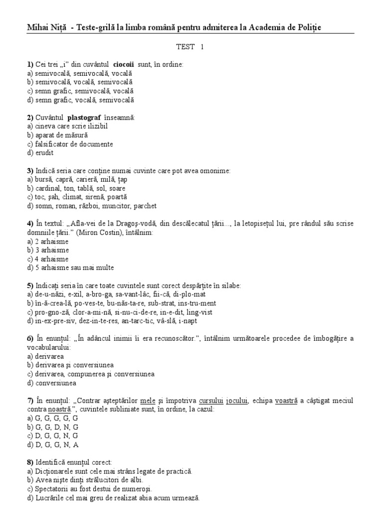 Teste Grila La Limba Romana Pentru Academia De Politie