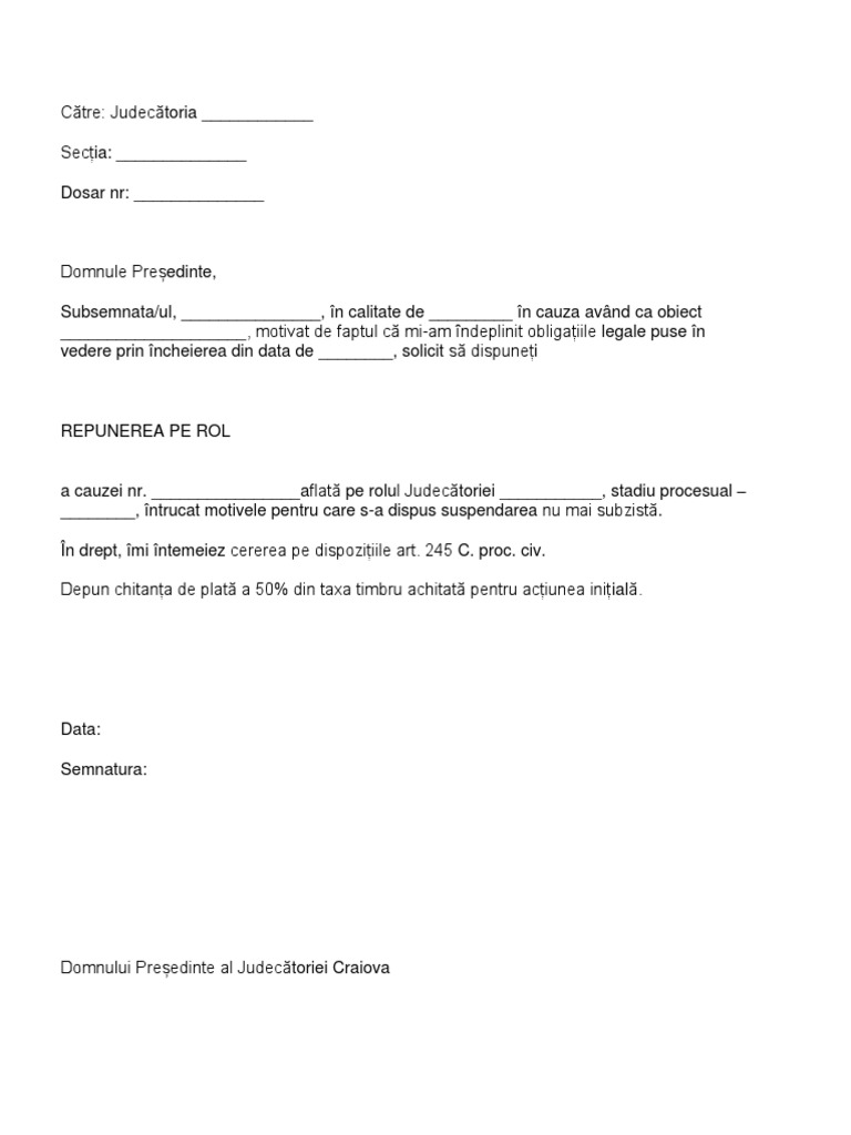 Model Cerere De Repunere Pe Rol
