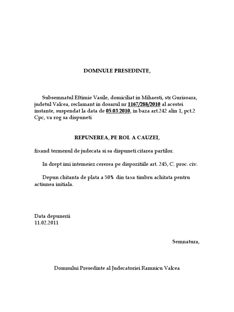 Cerere Repunere Pe Rol Doc
