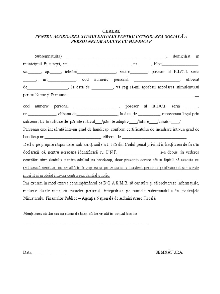Cerere Pentru Acordarea Stimulentului Pentru Integrarea Sociala A Persoanelor Adulte Cu Handicap