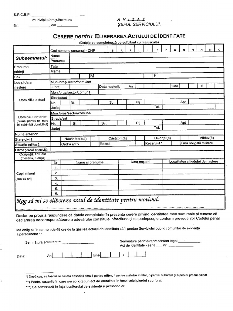 Cerere Pentru Eliberarea Actului De Identitate 18 Ani Model Completat