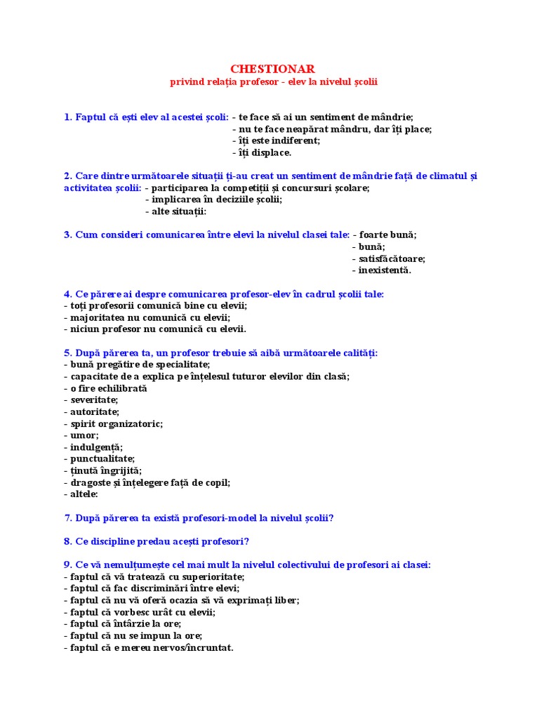 Chestionar Elevi Despre Profesori