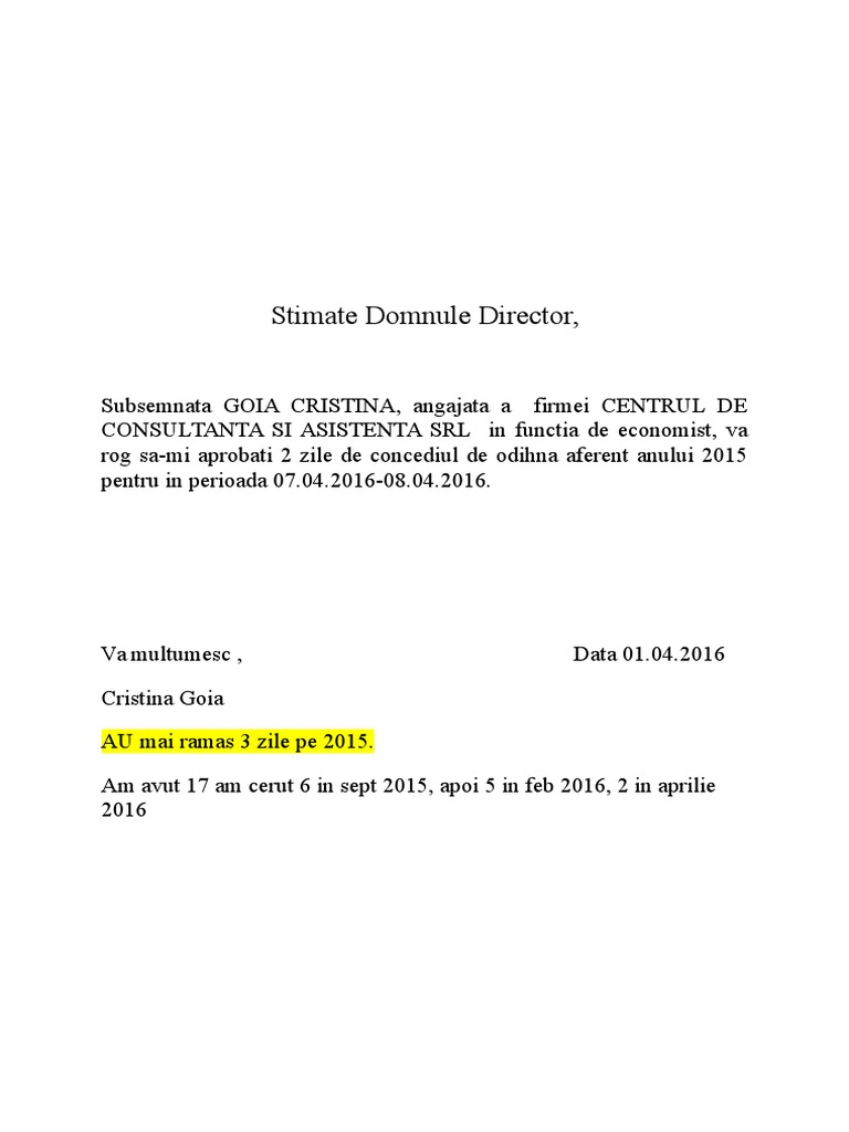 Model Cerere Concediu De Odihna An Scolar 2016 2017