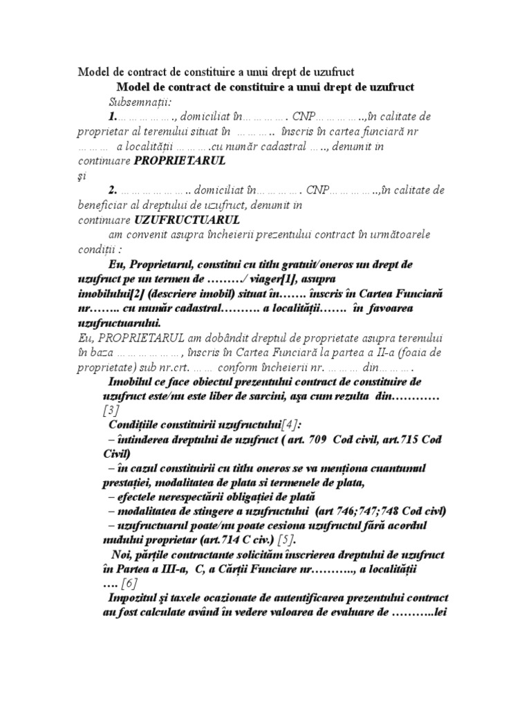 Model De Contract De Constituire A Unui Drept De Uzufruct
