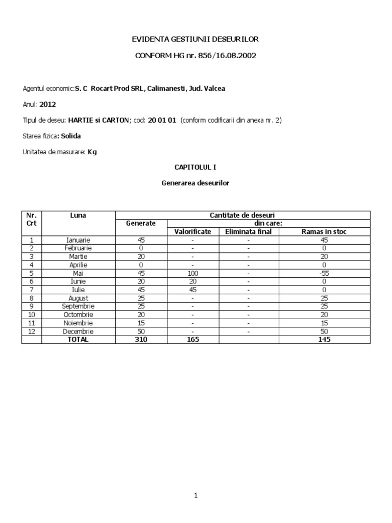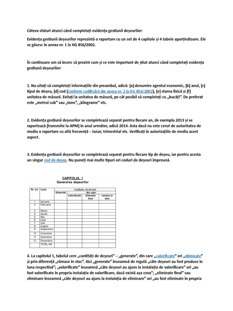 Evidența gestiunii deșeurilor termen de raportare. Desemnare persoana responsabila management deseuri. 856 2002 privind evidenta gestiunii deseurilor si pentru aprobarea listei cuprinzand deseurile. Jhonny last modified by.