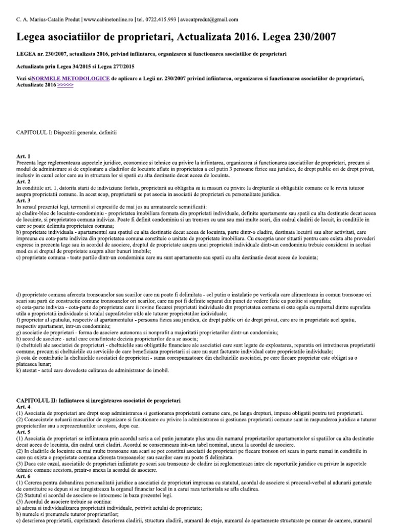 Legea Asociatiilor De Proprietari Legea 230 Din 2007 Actualizata 2016