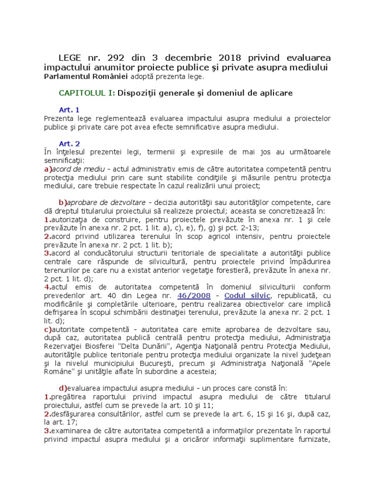 Legea Nr 292 Din 3 Decembrie 2018 Privind Evaluarea Impactului Anumitor Proiecte Publice și Private Asupra Mediului
