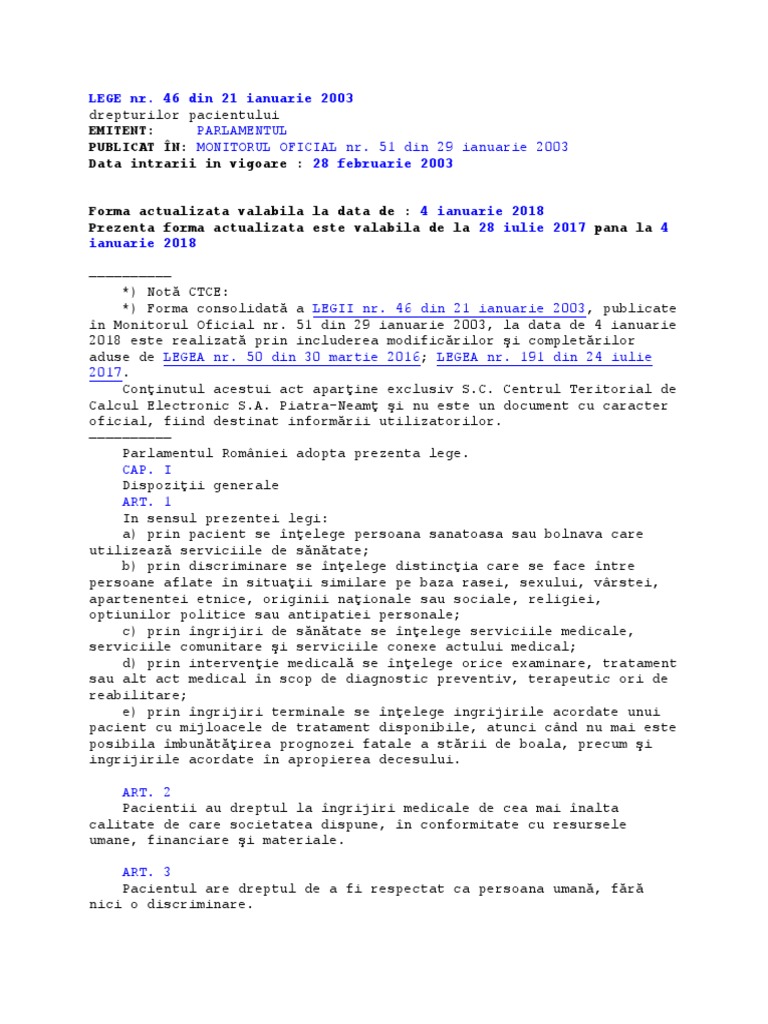 Legea 46 Din 2003 Drepturile Pacientului Norme Actualizata Pdf