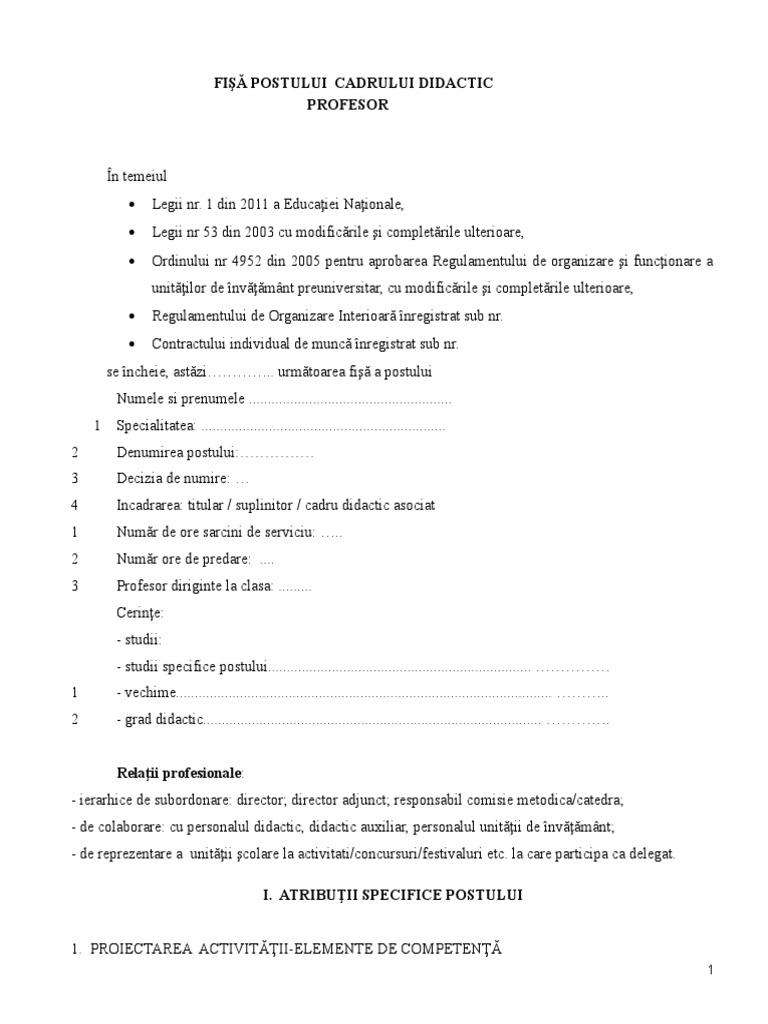 Model Fisa Postului Profesor Completata