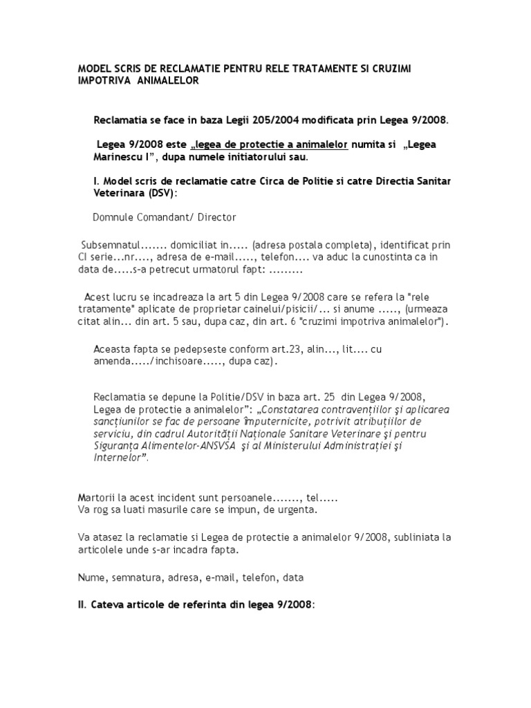 Model Scris De Reclamatie Pentru Rele Tratamente Si Cruzimi Impotriva Animalelor