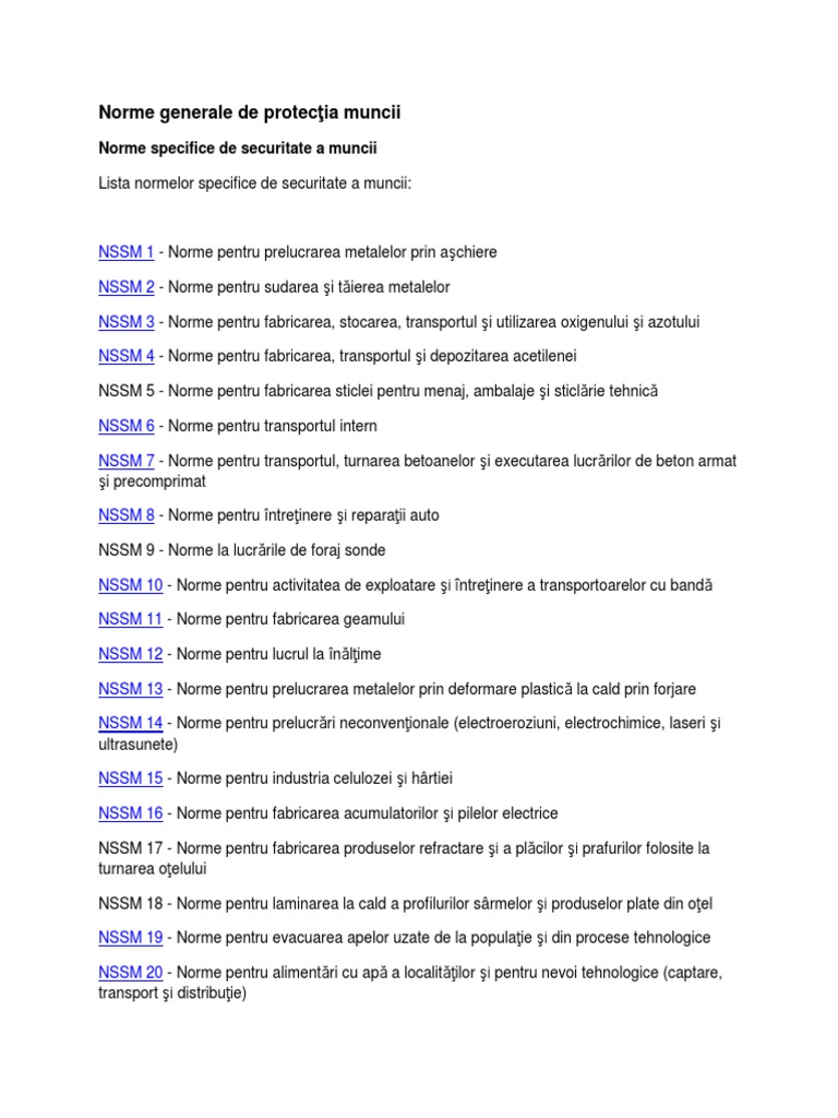 Normele specifice de securitate a muncii sunt reglementări cu aplicabilitate naţională care cuprind prevederi minimal obligatorii pentru desfăşurarea principalelor activităţi din economia naţională în condiţii de securitate a muncii. Nssm 51 norme de protectia muncii pentru prelucrarea pietrelor naturale şi a marmurei. Norme de protectia muncii norme generale de protectie a muncii. Normele generale de protectie a muncii acces la normele generale de protectia a muncii normele generale de protectie a muncii emise prin ordinul ministrului muncii si protectiei sociale nr.