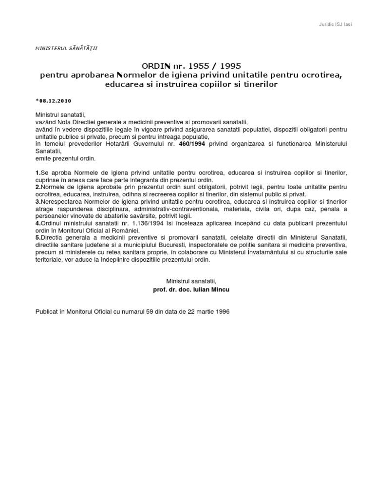 Ordin Nr 1955 1995 Norme De Sanatate In Scoli Juridic