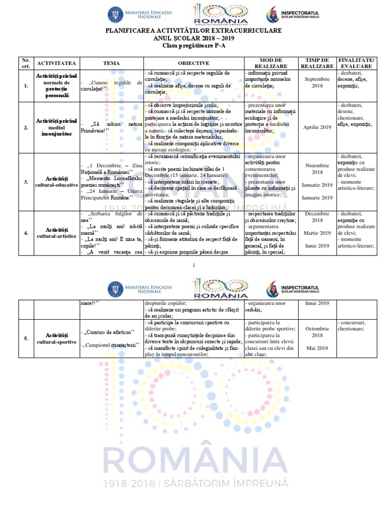 Planificarea Activităţilor Extracurriculare 2018 2019