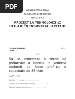 Proiect Dimensionarea Unei Sectii Care Prelucreaza Zilnic Lapte De Consum Pasteurizat Industria Alimentara 337778
