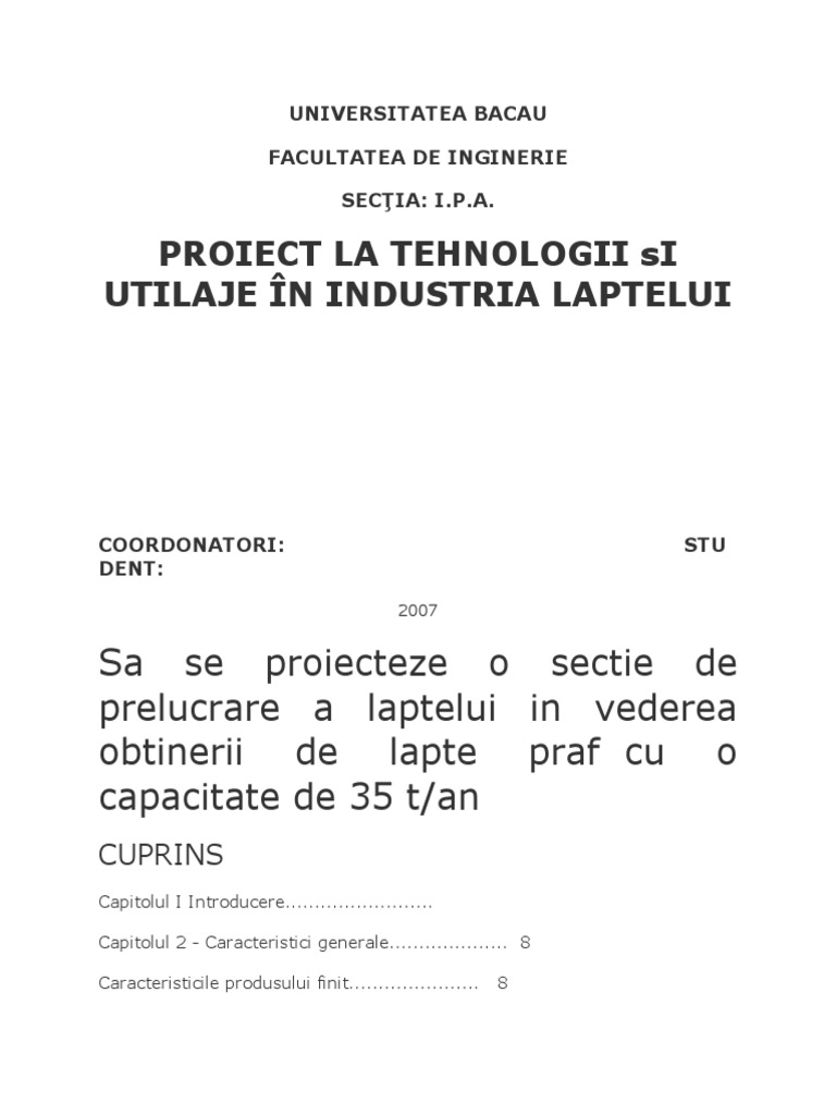 Proiect Proiectarea Unei Sectii De Procesare A Laptelui Industria Alimentara 288783