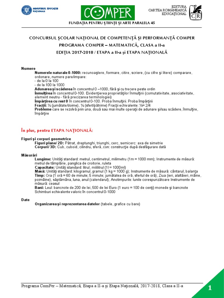 Programa comper matematică etapa i 2017 2018 clasa a v a 2 compararea puterilor utilizarea operaţiilor aritmetice şi a proprietăţilor acestora în calcule cu numere naturale selectarea şi utilizarea de algoritmi pentru efectuarea operaţiilor cu numere naturale exprimarea în limbaj matematica unor proprietăți referitoare la. An școlar 2020 2021 clasa a v a. Teza semestrul i la disciplina matematica an școlar 2017 2018 conține barem și rezolvări complete. 2 au spus mulţumesc.