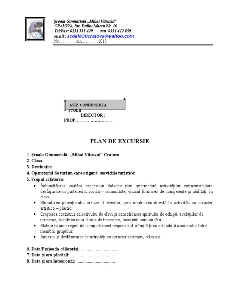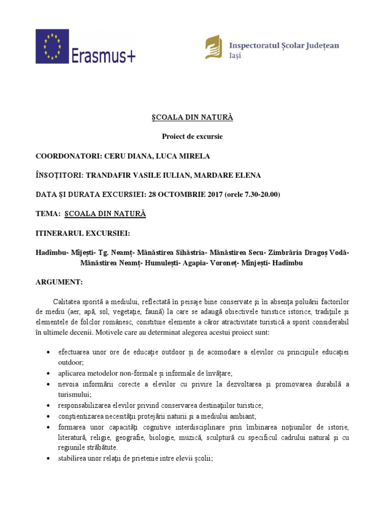 Proiect De Excursie Scolara Cu Scop Didactic Si Recreativ