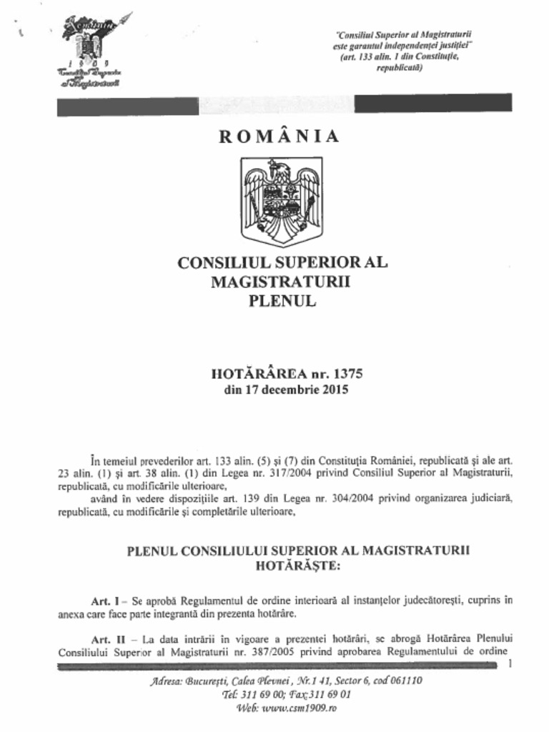 6616 Hotararea Csm 1375 2015 Regulament Ordine Interioara Instante Judecatoresti Pdf