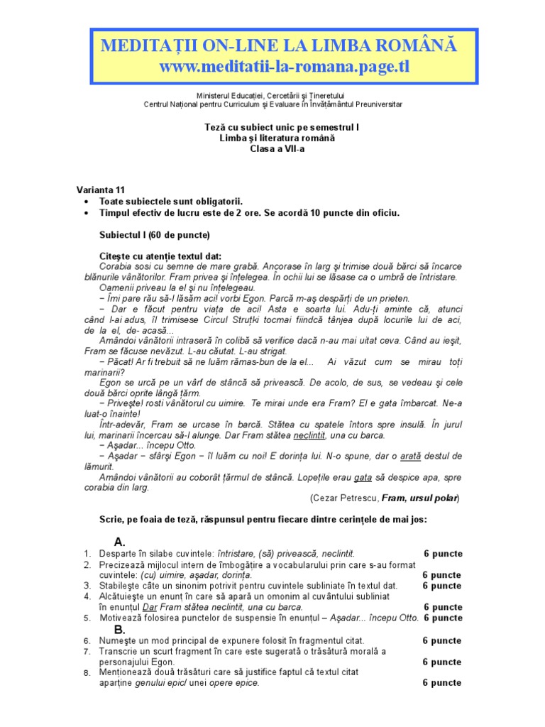 Romana Info Ro 2225 Teza La Limba Romana Semestrul I Clasa A Vii A
